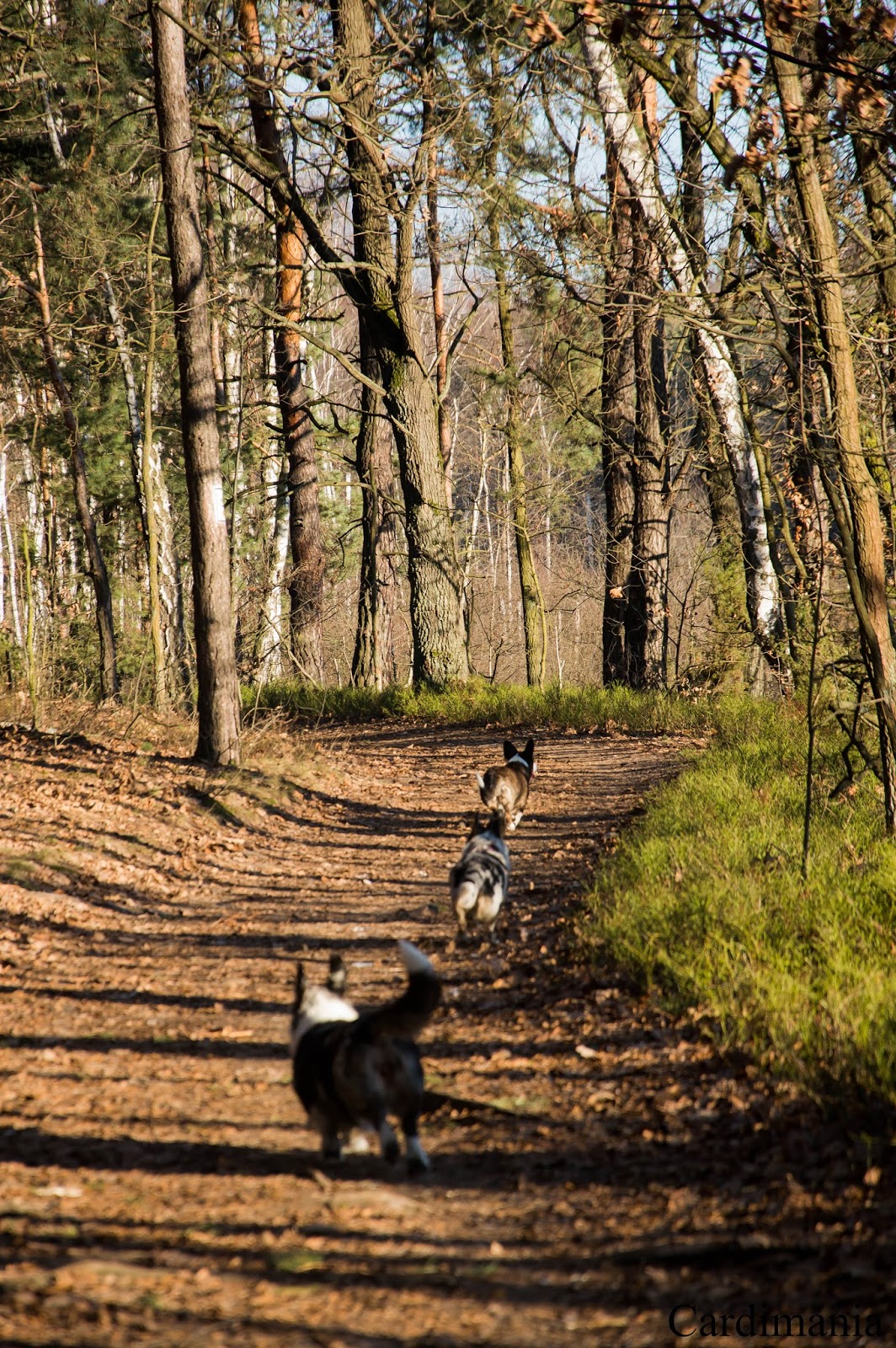 Konkretnej trasy Wam nie podpowiemy – my obeszliśmy ile się dało, klucząc, wracając i zawracając. Dotarliśmy do Leśniczówki, do zabudowań, nawet spalony dom z amerykańską flagą na kominie napotkaliśmy. Oprócz tego spotkaliśmy kilku rowerzystów, biegaczy i spacerowiczów. Większość na stadko ludzko-cardiganie reagowała standardowo – „ojeeeej, jakie uszy!” 🙂