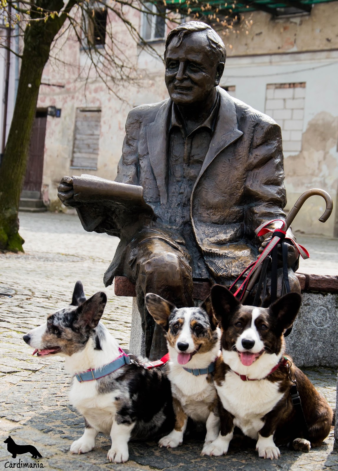 Z tą rzeźbą, która przedstawia Pana Jakuba Chojnackiego i jego ulubionego pieska, związana jest zabawna historia. Spacerowaliśmy i nagle wyłoniła się ta postać na ławeczce, więc skręciliśmy w jej stronę. Dziewczyny zauważyły i pana i psa i wystartowały się przywitać. A tu nic, zero reakcji na ich obecność. Chodziły, oglądały, obszczekiwały. Zebrała się całkiem pokaźna grupka gapiów, która obserwowała zajście, a co jakiś czas były salwy śmiechu. Największą sympatię zyskała Twiggy, która usiadła Panu Jakubowi na kolanach i była bardzo dumna z siebie.