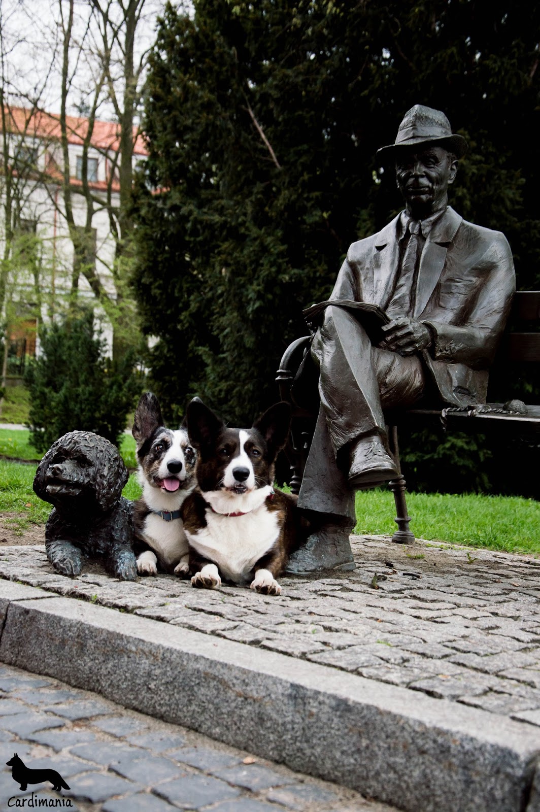 Nasze psy zaintrygował pewien jegomość, który siedział i nie wołał, nie wyciągał ręki a my kazaliśmy im podejść. Trafiliśmy na pomnik, naturalnej wielkości Wacława Milke, który jak się okazało był założycielem najstarszego dziecięcego Zespołu Pieśni i Tańca.