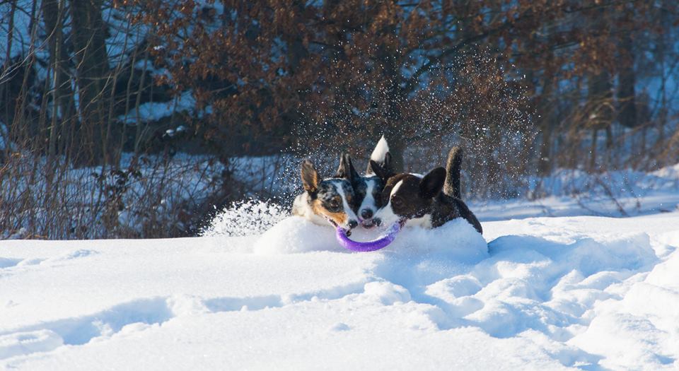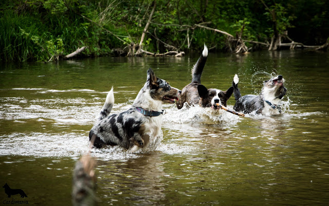 Na górze schodów stoją 3 głowy, które bystro patrzą co się dzieje. Moje psy wyglądają jakby wypiły już co najmniej 3 kawę, a dopiero co chrapały. Chcąc nie chcąc znoszę psy na dół, biorę kawę i wychodzimy na ogród. Psy najpierw robią rundę honorową dookoła, potem pędzą nad strumień, a następnie rozpoczyna się pogoń z nagonką w każdą możliwą stronę. Dziewczyny mają bardzo dużo energii, pamiętacie jeszcze ERCC – Energia Rozpierająca Ciało Cardigana?! To jest najwłaściwsze nazwanie stanu moich psów. Po wypiciu kawy, milionie przewrotek i podgryzań idziemy nad potok, a następnie do domu. Psy są czyste, a ja spokojnie mogę zasiąść do pracowania i zapomnieć o książce.